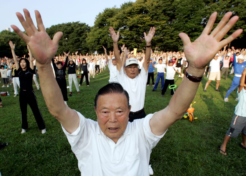 圖為 2007年時,在日本的茅崎市(Chigasaki),一名男子正跟著大家一起跳廣播操。
