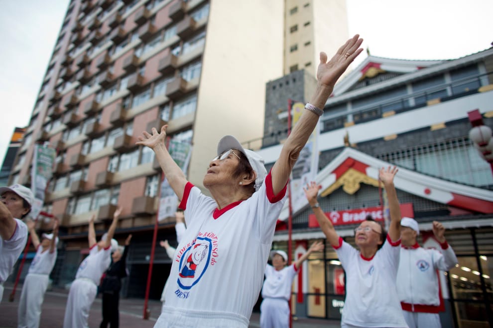 近年來,巴西、祕魯等有大量日本僑民居住的地區,也吹起一股「廣播操」的熱潮。圖為 2018年在巴西聖保羅市內的亞洲社區的廣場,日本的長輩們聚集在一起跳廣播操。