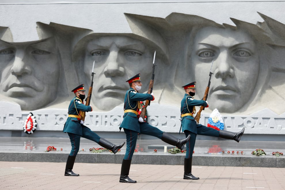 在屬於北高加索地區的斯塔夫羅波爾(Stavropol),儀隊踢著正步經過第二次世界大戰紀念碑。