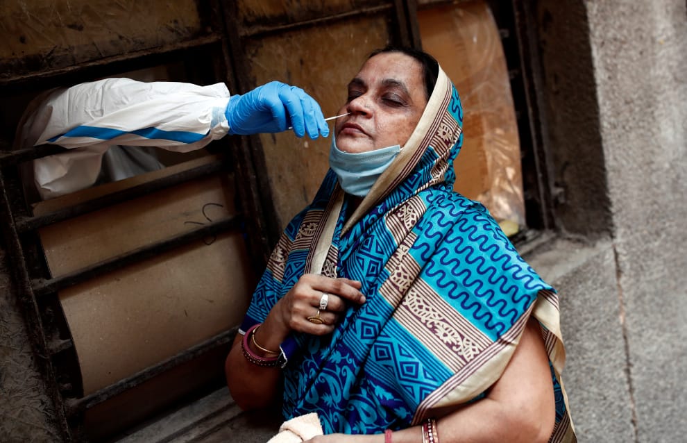 在新德里一間由學校改建而成的臨時檢測站內,醫護人員正在替一名女子做病毒檢測。