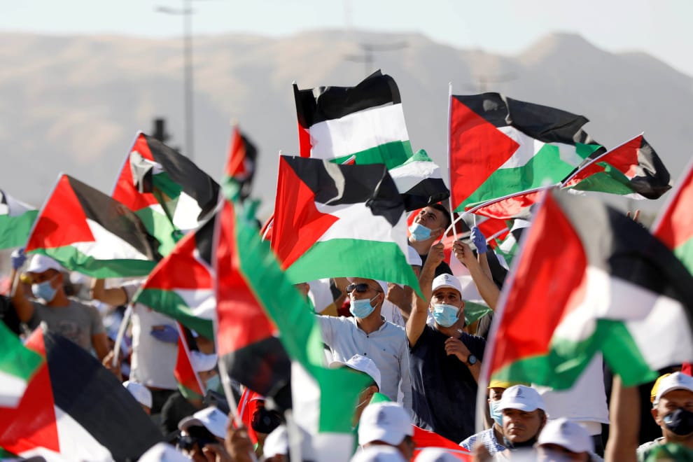在以色列計畫併吞的約旦河西岸耶利哥市(Jericho),巴勒斯坦解放組織(Palestinian Liberation Organization,PLO)號召巴勒斯坦民眾揮舞國旗抗議,要求以色列放棄他們的併吞大計。