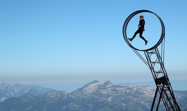 在阿爾卑斯山的滑雪勝地迪亞布勒雷特(Les Diablerets),瑞士雜技演員凱瑟林納(Ramon Kathriner)為觀眾帶來「死亡之輪」(Wheel Of The Death)的表演。