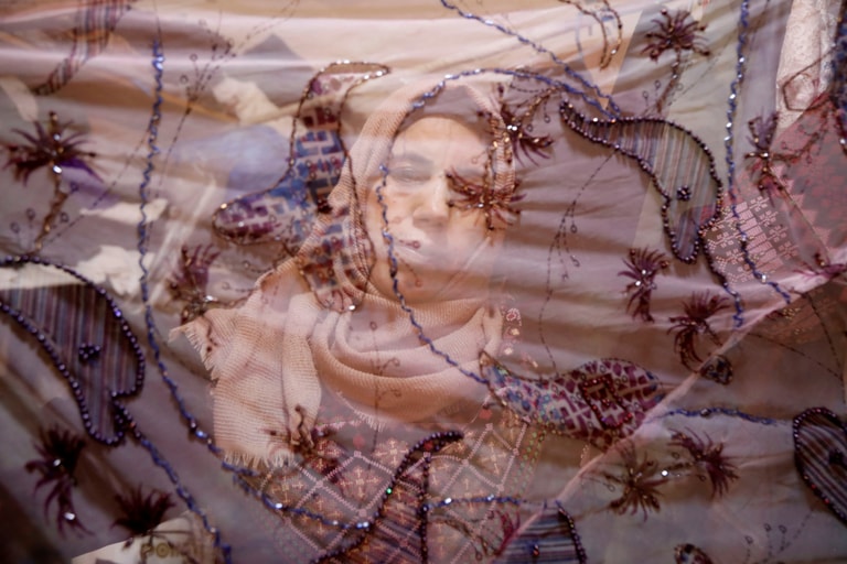 在國際寡婦日這一天,丈夫死於癌症的艾伊莎(Manal Al-Essa)正在手縫洋裝準備出售。