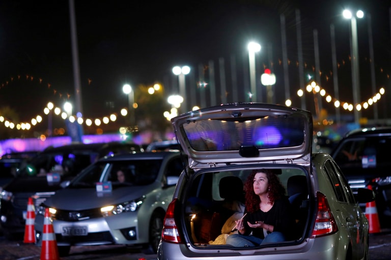 在首都巴西利亞剛開張的得來速劇院內,民眾驅車前來欣賞巴西利亞交響樂團的演出。
