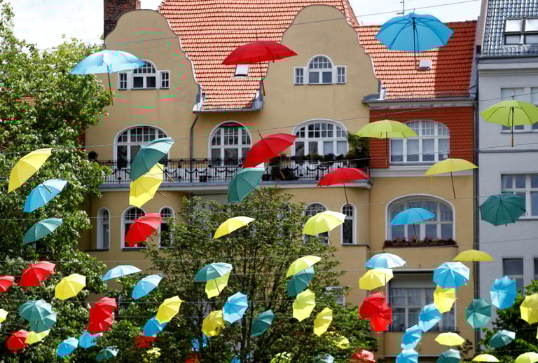在柏林夏洛滕堡區(Charlottenburg district),當地民眾為了迎接即將登場的美酒節,在天空掛起了一支支五彩繽紛的雨傘。