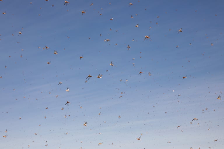 在位於西部的圖爾卡納郡(Turkana county),可以看到漫天飛舞的沙漠蝗蟲,牠們的出現破壞了農人辛苦的農作,也預示了糧食危機的到來。