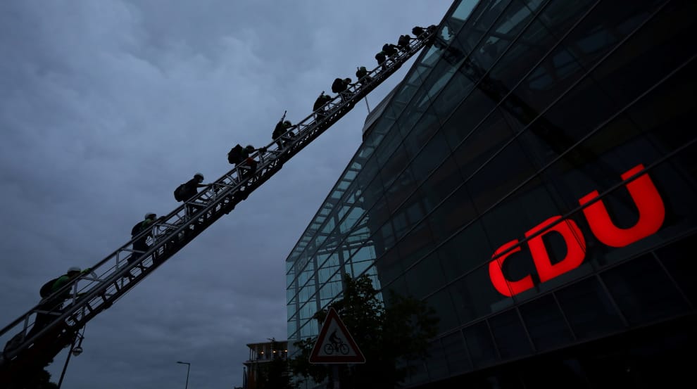 在德國總理梅克爾(Angela Merkel)所屬政黨「基督教民主聯盟」(Christian Democratic Union,CDU)設於首都柏林的總部,綠色和平組織(Greenpeace)的成員趁著夜黑風高爬上建築,抗議CDU的火力發電廠退場計畫不夠有野心,對火力發電廠公司的補助過高。