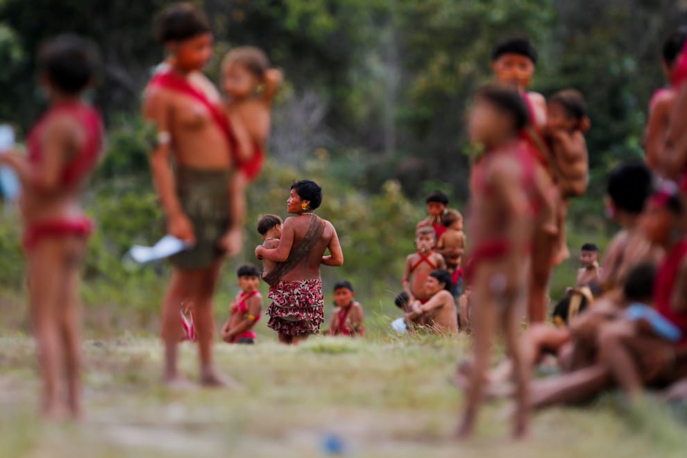 在巴西北部羅賴馬州(Roraima)的上阿萊格雷市(Alto Alegre),巴西原住民亞諾馬米人(Yanomami)聚在一塊,等待當局的防疫措施。