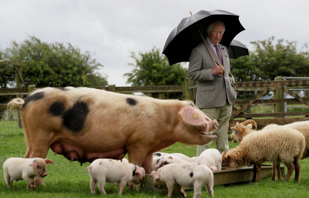 在格洛斯特郡(Gloucestershire)的柯茲窩(Cotswold)農場公園,英國查爾斯王子(Prince Charles)看著當地著名品種格洛斯特郡花豬(Gloucestershire Old Spot pig)。這種英國本地品種的豬,最明顯的特徵就是身上的斑點,還有母豬產子數和產乳量都很高。