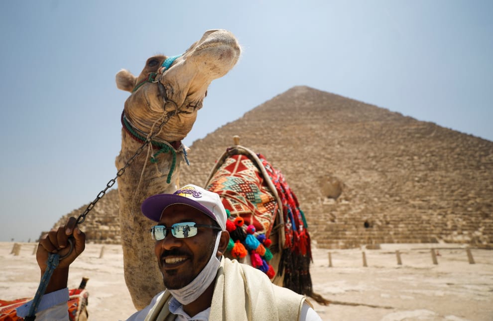 在開羅郊外、埃及最大的吉薩金字塔群(Giza pyramid complex)前,當地旅遊業者開心牽著駱駝迎向重新回流的觀光客。近日,埃及當局宣布解封,重新開放觀光客前往吉薩金字塔群參觀。