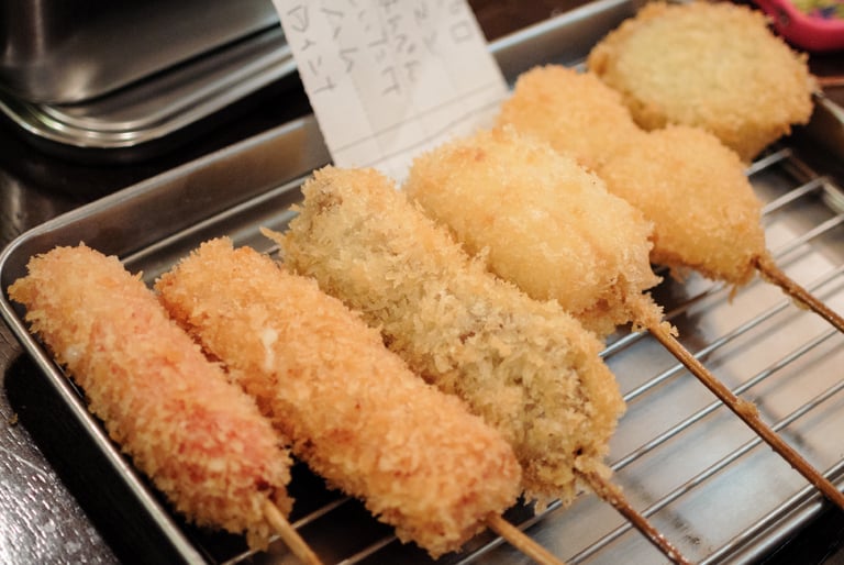 而在勞工聚集地的大阪新世界地區,這裡充滿了讓人吃粗飽又便宜的小吃。其中,一間食堂的老闆突發奇想,將食材切成一口大小後用竹籤串起來,裹上麵糊和麵包粉後下鍋油炸,再搭配便宜的價格,一夕之間蔚為風潮,炸串就這麼誕生了!
