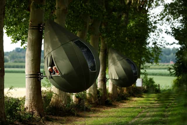 在比利時博爾赫隆(Borgloon)附近的郊區,荷蘭藝術家瓦普納爾(Dre Wapenaar)製作數個水滴型的懸掛樹屋供遊客入住。入內體驗時,兩名遊客從中探出頭來。