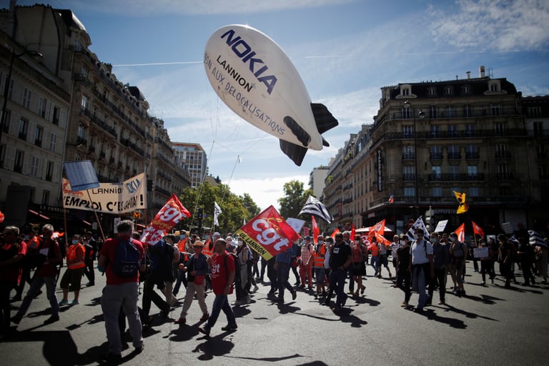 在法國首都巴黎,Nokia公司內部傳出裁員的風聲,工會立即號召大家發動罷工反對裁員計畫。示威過程中,員工們帶著畫上Nokia公司品牌標誌的氣球一同上街。