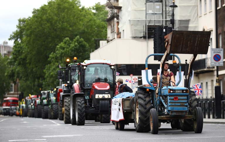 在英國首都倫敦,農夫們駕駛著曳引機在倫敦街頭抗議。農夫們主張,英國政府正在審查的新農業法法案通過後,將會讓英國農產品市場充斥大量廉價、品質低劣的農產品,拖垮英國世界級的農業水準。