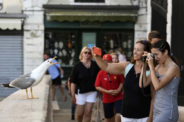 在義大利的威尼斯(Venice),兩名路人各自舉起手機和相機,替里阿爾托橋(Rialto Bridge)上一隻海鷗拍照。