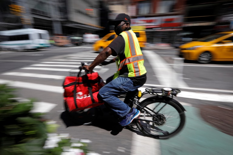 在美國紐約,Grubhub公司的外送員騎著單車,飛快地穿梭在曼哈頓街頭。
