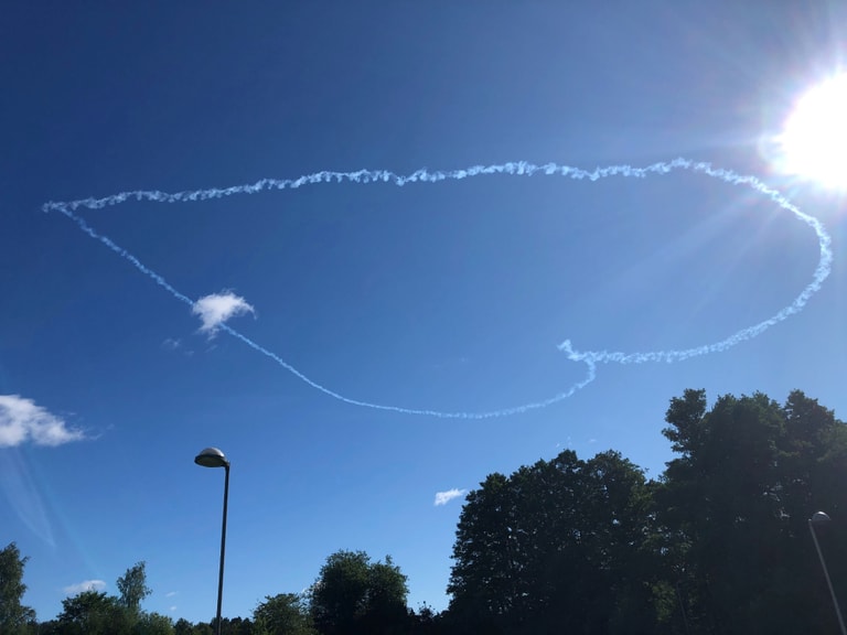 在瑞典首都斯德哥爾摩(Stockholm)上空,兩名參加斯堪地那維亞航空展(Scandinavian Airshow)的飛行員合作,在天空完成一個大大的愛心。