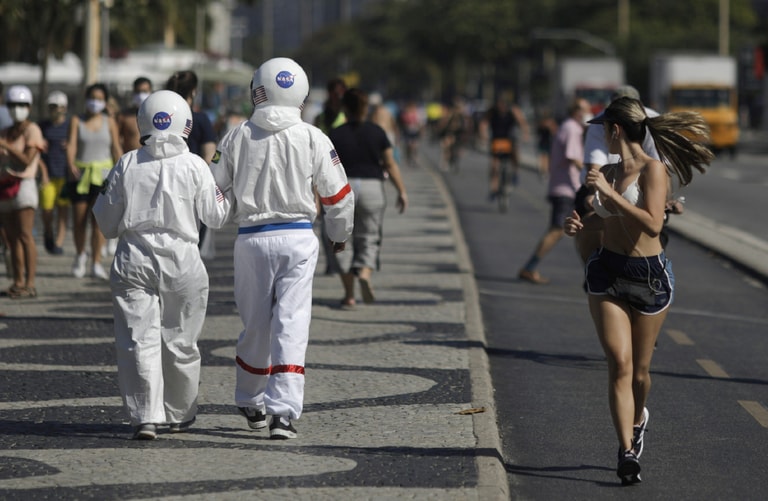 在巴西大城里約熱內盧Copacabana海灘附近的人行道上,66歲的加爾迪諾(Tercio Galdino)和 65歲的妻子愛麗琪亞(Aliceia)一同穿上自製的「太空防護裝」走在大街上,避免感染COVID-19(武漢肺炎)。