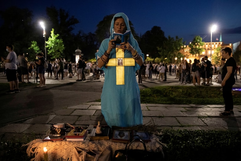 在塞爾維亞首都貝爾格萊德(Belgrade)的國會大廈前,反政府示威活動已經持續多天。在其中一場示威活動中,一名婦女雙膝跪下,默默朗讀一本宗教經典,胸前的十字架在鏡頭下靜靜地發著光。
