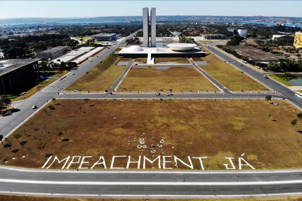 在巴西首都巴西利亞的國會大廈前,不滿巴西總統波梭奈羅(Jair Bolsonaro)執政的示威者,在國會大廈前的草地寫上大大的「立刻罷免總統!」標語。