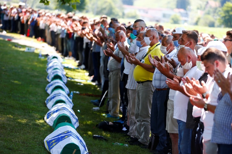 在波士尼亞赫塞哥維納東部小鎮Potocari,人們聚集在埋葬大屠殺罹難者們的墓園中舉辦一場 25周年的祈禱會,許多遺族們都戴上口罩出席,為當年遇難的親人們祈禱。