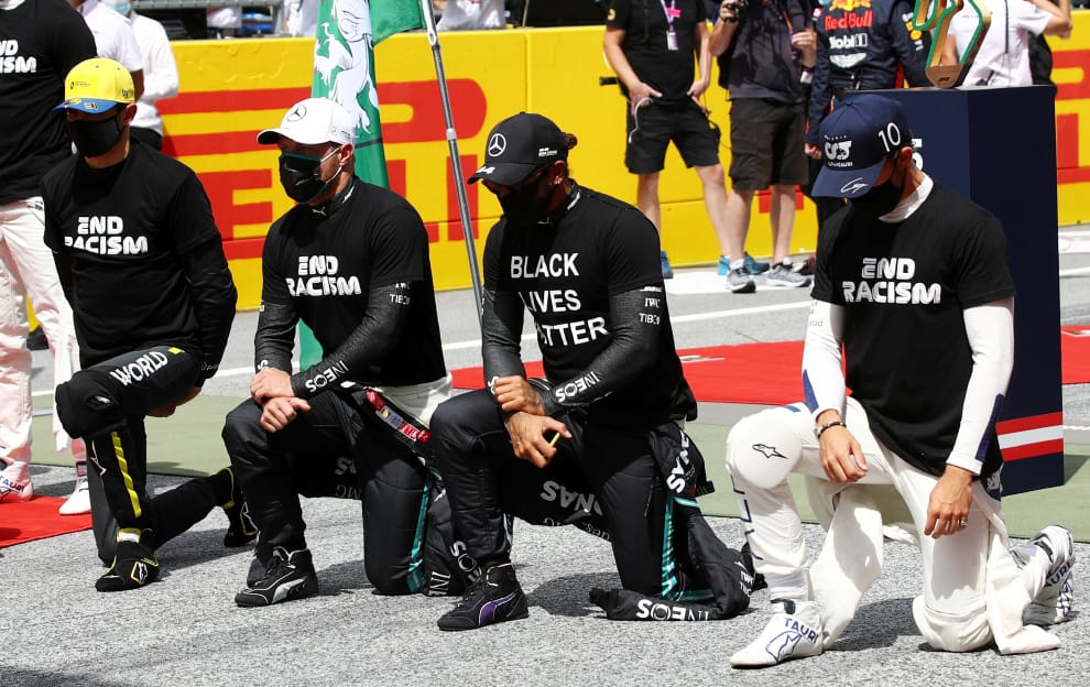 在奧地利中部小鎮施皮爾貝格 (Spielberg)舉辦的F1施泰爾馬克大獎賽(Steiermark Grand Prix)開賽前,以梅賽德斯車隊(Mercedes)的漢米爾頓(Lewis Hamilton,右二)為首的 4名車手穿上支持「黑人的命也是命」(Black Lives Matter)活動的衣服,單膝跪下以表支持。