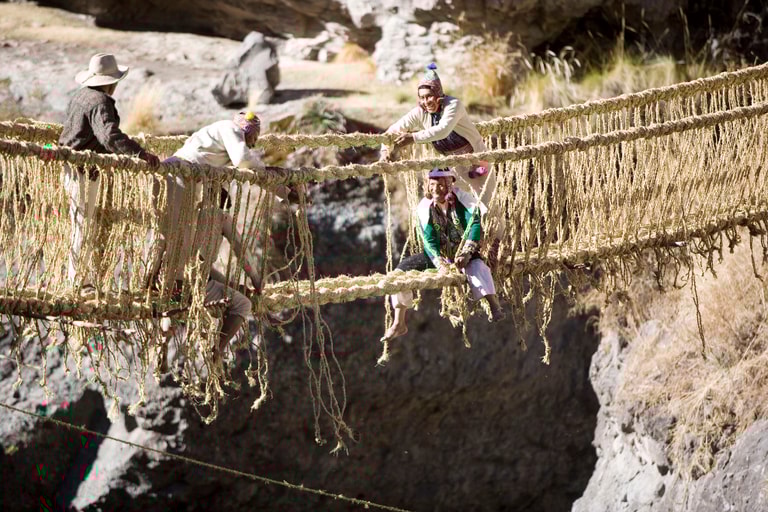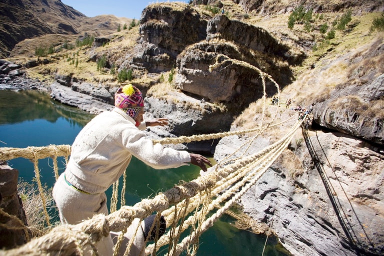 在秘魯安地斯山脈的阿普里馬克河(Apurimac river),懸掛著一座由草繩搭建出的繩橋,不僅是古印加人智慧的結晶,也是部落之間合作的產物,更是秘魯原住民努力保留傳統文化的成果。