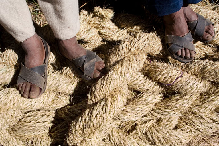 繩橋的原料是一種當地人稱為qoya ichu的硬草,在收割後,還必須用石頭敲打、用水浸泡,才能搓揉成為一條條的細繩。