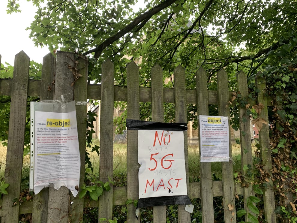 在英國東倫敦地區的聖三一教堂(Holy Trinity Church),反對 5G設備的示威者將標語貼在教堂的柵欄上。