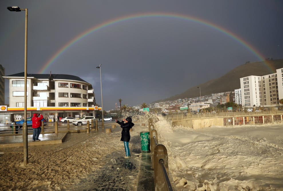 在南非大城開普敦(Cape Town),近日冷鋒抵達,人們紛紛換上保暖衣物禦寒。在堤坊邊,一名女性抓準大浪抵達的時機,趁機拍下一張自拍照。