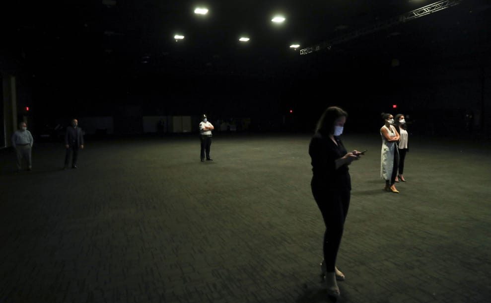 在德拉瓦州的威明頓(Wilmington),美國總統大選民主黨籍候選人拜登(Joe Biden)正在台上發表他的氣候政策,但台下受限於COVID-19(武漢肺炎)防疫措施,只剩下幾名拜登陣營的工作人員和維安人員在聆聽。