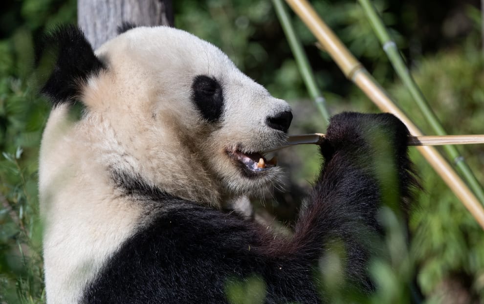 在奧地利首都維也納的美泉宮動物園(Schoenbrunner Tiergarten zoo),一隻大貓熊坐在地上賣力咀嚼一小段竹子。