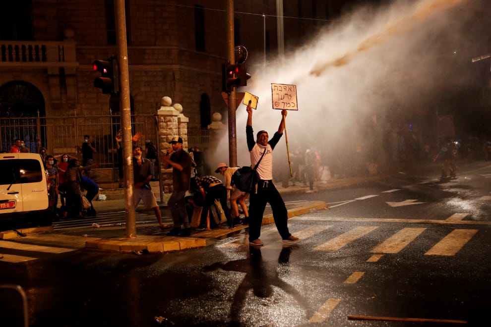 在以色列總理納坦雅虎(Benjamin Netanyahu)位於耶路撒冷的住處附近,警方正用水砲驅離一名示威者,他和其他民眾一起抗議以色列政府處理COVID-19(武漢肺炎)財政危機不當。當時,他手上正高舉著寫上希伯來文「愛你的鄰居」標語。