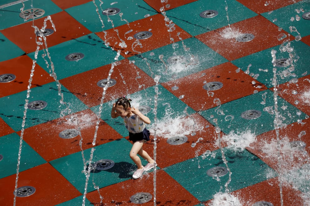 在中國北京,一名小女孩在綜合購物中心的戲水區玩水。