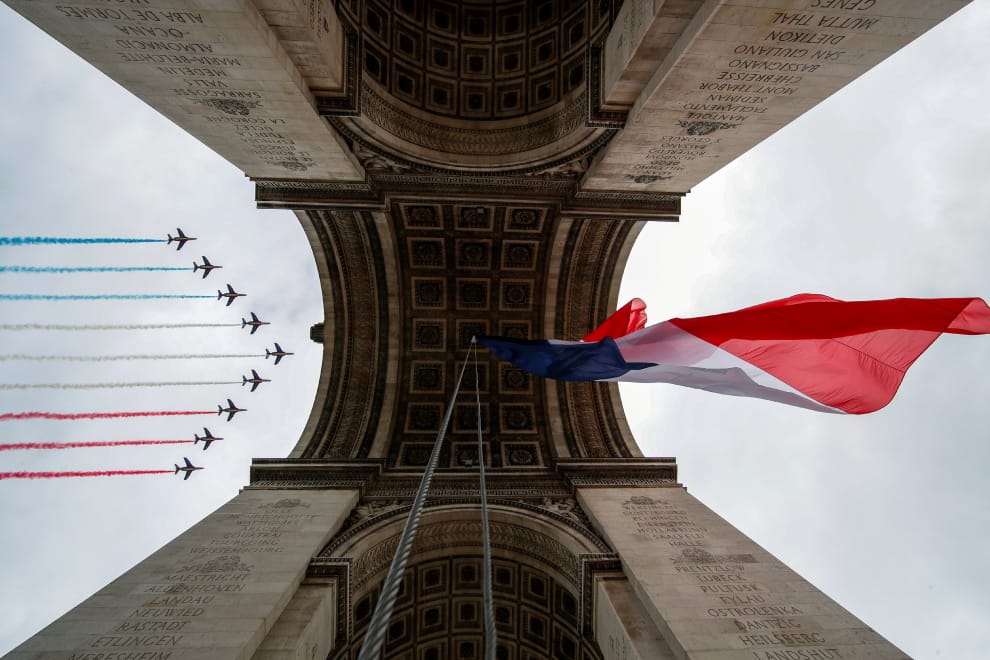 在法國國慶日(Bastille Day)這天,巴黎凱旋門上空飛過 9架隸屬於法國空軍巡邏兵飛行表演隊(French Air Force Patrouille de France)的阿爾法教練機(Alpha jets)。