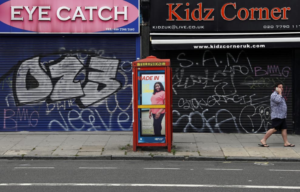 在英國倫敦街頭,一名男子經過商業區一座貼著廣告的紅色電話亭。