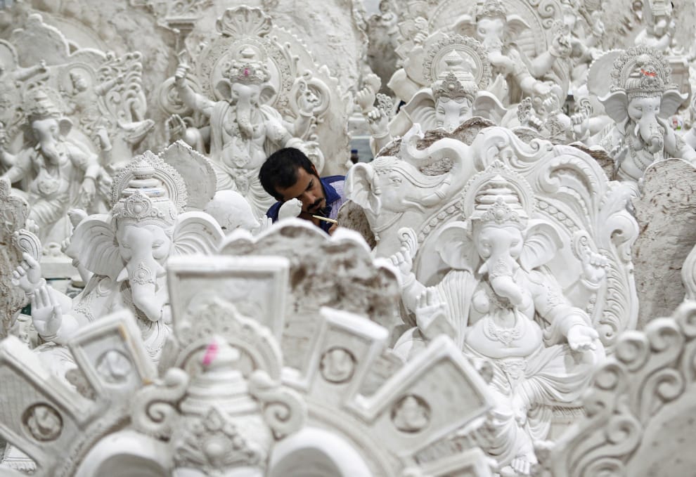 在印度大城孟買,固定於每年 8月22日舉辦的象神節(Ganesh Chaturthi festival)近在眼前,一名男子蹲在一尊尊象神雕像中間,趕工製作屆時要使用的象神雕像。