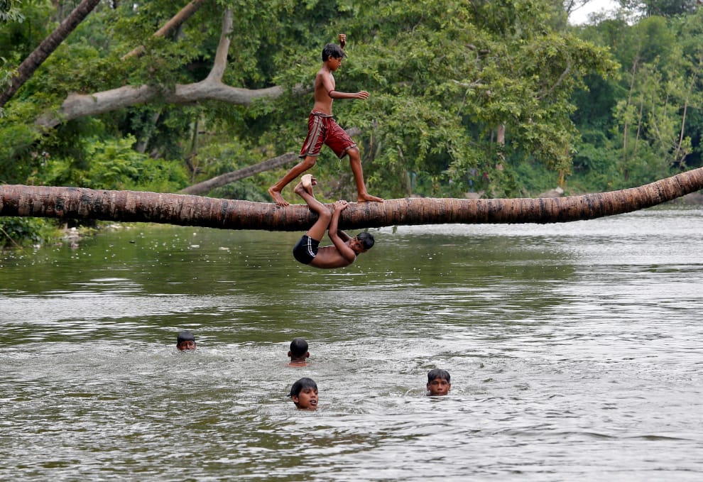 在印度大城加爾各答(Kolkata)郊區的一座湖泊,一名男孩從樹枝上快步跑過,準備從椰子樹的樹枝上跳入湖中。