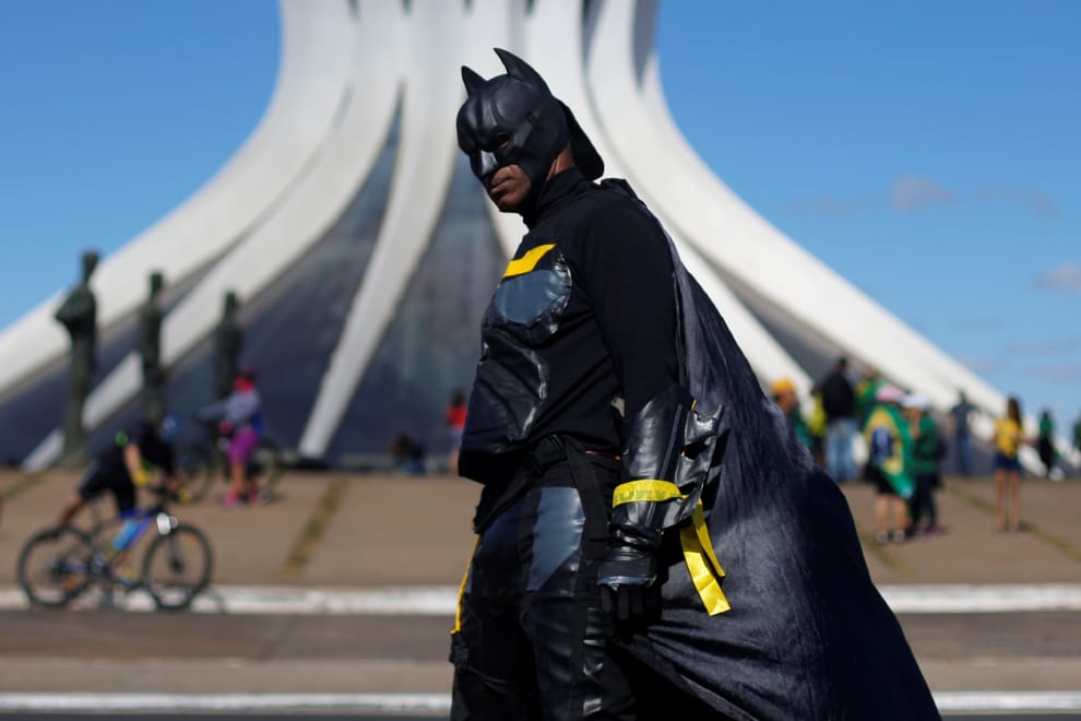 在巴西首都巴西利亞的巴西利亞主教座堂(Brasilia Cathedral)前,一名示威者打扮成蝙蝠俠的樣子,參加一場支持巴西總統波梭奈羅(Jair Bolsonaro)的遊行。
