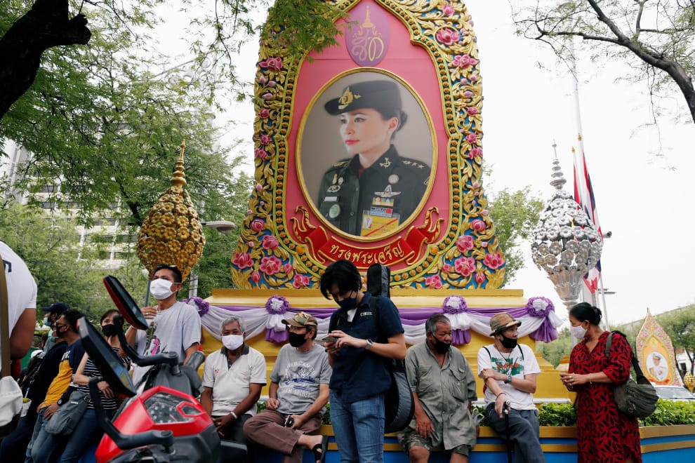 在泰國首都曼谷的泰國皇家陸軍團總部(Royal Thai Army)前,反政府人士戴著口罩,坐在現任泰國王后蘇堤達(Suthida Tidjai)的肖像底下,準備稍晚繼續展開要求現任泰國總理帕若育(Prayut Chan-o-cha)下台的示威活動。