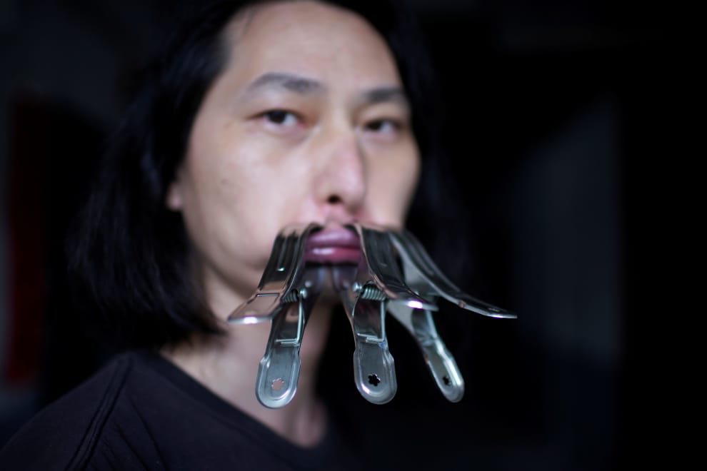 在中國上海,中國行為藝術家堅果兄弟(Brother Nut)將三個金屬夾夾在自己的嘴巴上。