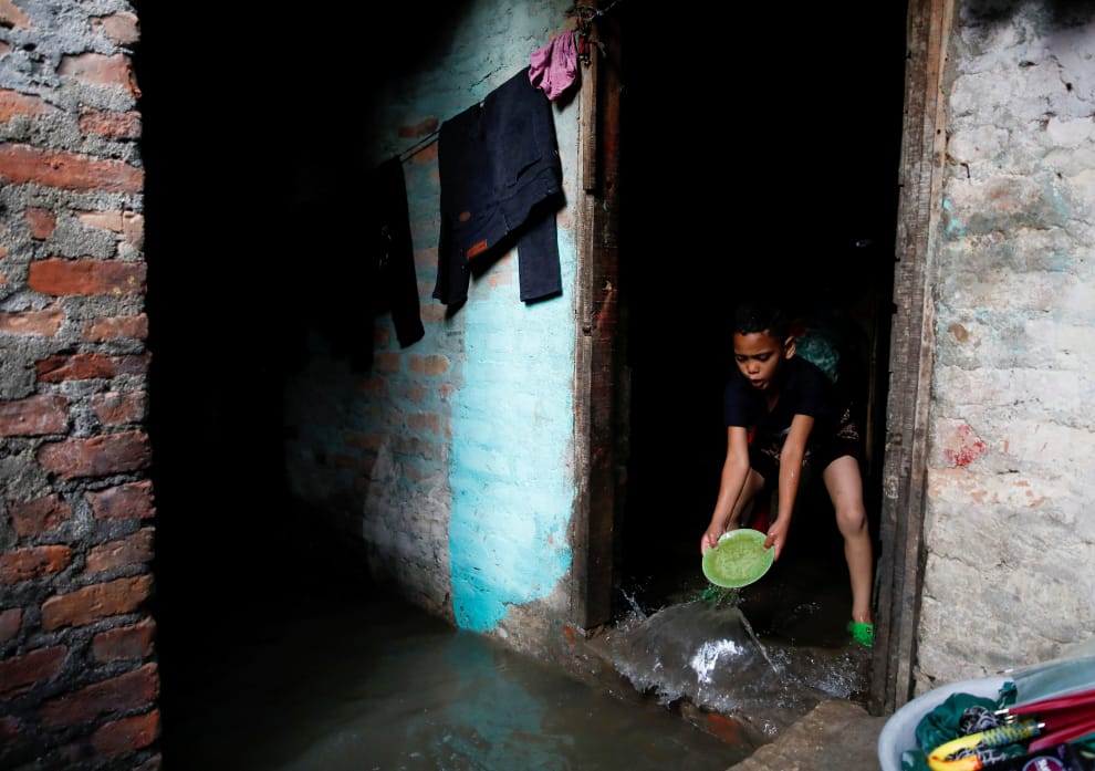 在尼泊爾首都加德滿都(Kathmandu),連日大雨讓巴格馬蒂河(Bagmati River)的河水漫過河堤,沖進附近的一座貧民窟中,也湧進這名小男孩的家裡,而他僅能靠手中的一個盤子,將不斷湧入家裡的河水舀出家門。