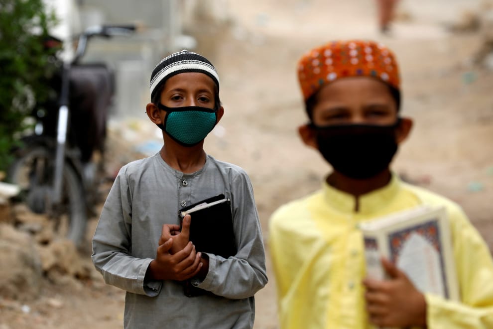 在巴基斯坦大城喀拉蚩(Karachi),近日國內的COVID-19(武漢肺炎)疫情漸趨緩和,當局宣布重啟為國內兒童施打小兒麻痺疫苗的計畫。在一個以低收入戶為主的住宅區中,攝影師拍下兩名男孩抱著課本,準備前往伊斯蘭宗教學校(madrasa)上課的身影。