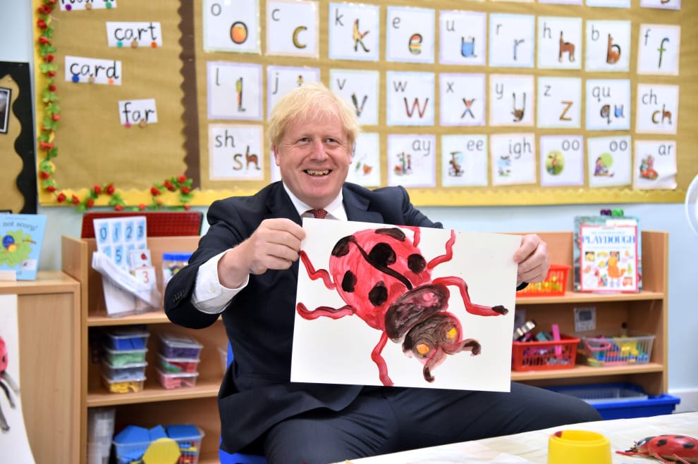 在英國倫敦肯特郡(Kent)的探索學校(The Discovery School),英國首相強生(Boris Johnson)對著鏡頭展示一幅瓢蟲畫作。