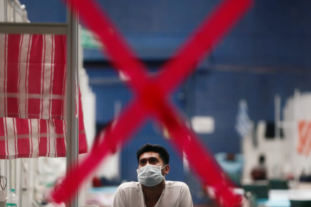 在印度首都新德里一間療養中心的室內運動中心內,攝影師透過窗上一個大大的紅色「X」記號,拍下一名男子抬頭看電視的身影。