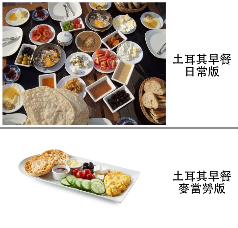 羊奶起司、黑橄欖、小黃瓜、番茄、炒蛋、果醬與英式馬芬,這個幾乎看不到麥當勞影子的土耳其麥當勞早餐(Breakfast Platter),反應的是土耳其對於早餐的重視。