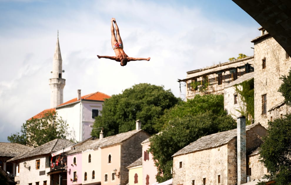 在第 454屆傳統跳水比賽上,一名男子從莫斯塔爾古橋(Stari most)上縱身跳進水流湍急的內雷特瓦河(Neretva River)裡。關於當地的跳橋傳統最早可以追溯至 1664年,目的是要彰顯自己優良的潛水技巧,現在跳水比賽則成為當地著名的活動。