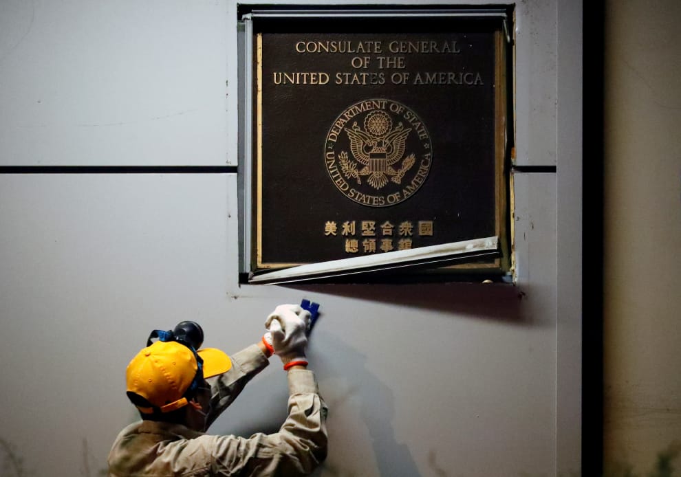在四川省成都市,工作人員正在移除美國駐成都總領事館的招牌。上周五(24)時,中國政府宣布關閉該總領事館,並且要求美國外交人員在 72小時內撤離,作為對美國關閉中國駐休士頓總領事館的回應。