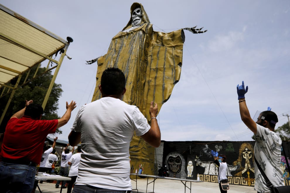 在疫情管制令放鬆後,位於墨西哥市市郊的死亡聖神(La Santa Muerte)廟也重新開張,迎接前來膜拜的信徒。死亡聖神是墨西哥民間信仰的女神,祂通常是一具穿著長袍,手拿鐮刀和地球儀的骷髏,具有神聖的治癒力,並且能夠保護信徒來世的安全。