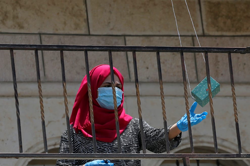 在巴勒斯坦小鎮拜特烏瑪(Beit Ummar),一名女子伸手接過由無人機空投的維他命補給品。